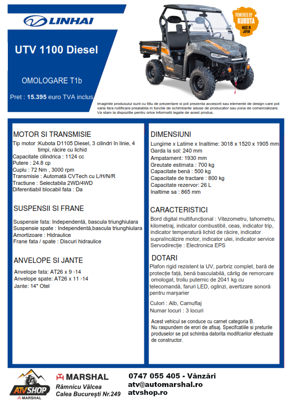 DotăriPlafon rigid rezistent la UV, parbriz complet, bară de protecție față, benă basculabilă, cârlig de remorcare omologat, troliu puternic de 2041 kg cu telecomandă, oglinzi, avertizare sonoră pentru marșarier