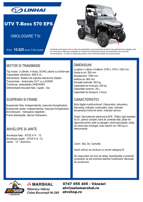 | Dotări | Plafon rigid rezistent la UV, parbriz complet, bară de protecție față, plase de siguranță pentru șofer și pasageri, benă basculabilă, cârlig de remorcare omologat, troliu electric de 1360 kg cu telecomandă |