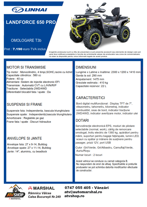 | Dotări | Moduri de pilotare selectabile (normal, work), cârlig de remorcare omologat, troliu electric de 1360 kg, apărători pentru mâini, bară de protecție față/spate, suporturi pentru bagaje față/spate, scaun cu spătar și mânere de susținere pentru pasager, priză 12V, port USB |