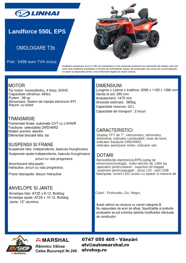 | Dotări | Cârlig de remorcare omologat, troliu electric de 1360 kg, apărători pentru mâini, suporturi pentru bagaje față/spate, scaun cu spătar și mânere de susținere pentru pasager, priză 12V, port |