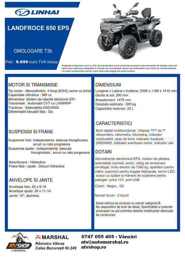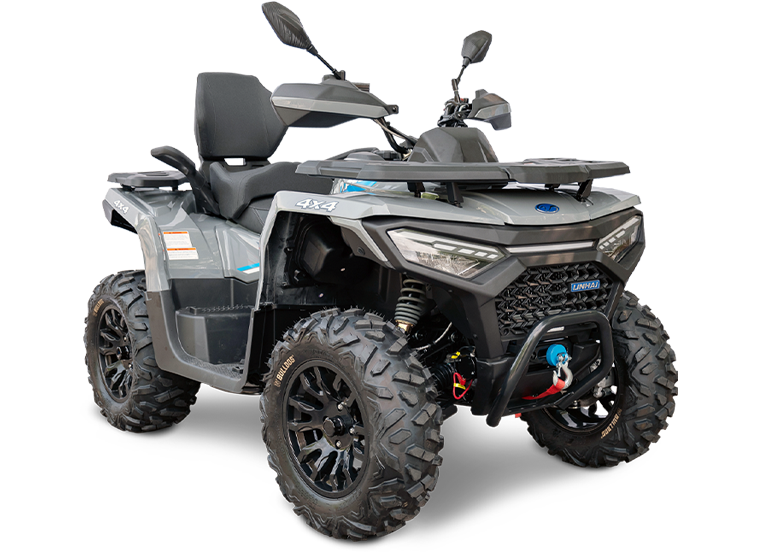 | Dotări | Moduri de pilotare selectabile (normal, work), cârlig de remorcare omologat, troliu electric de 1360 kg, apărători pentru mâini, suporturi pentru bagaje față/spate, lumini LED, scaun cu spătar și mânere de susținere pentru pasager, priză 12V, port USB |